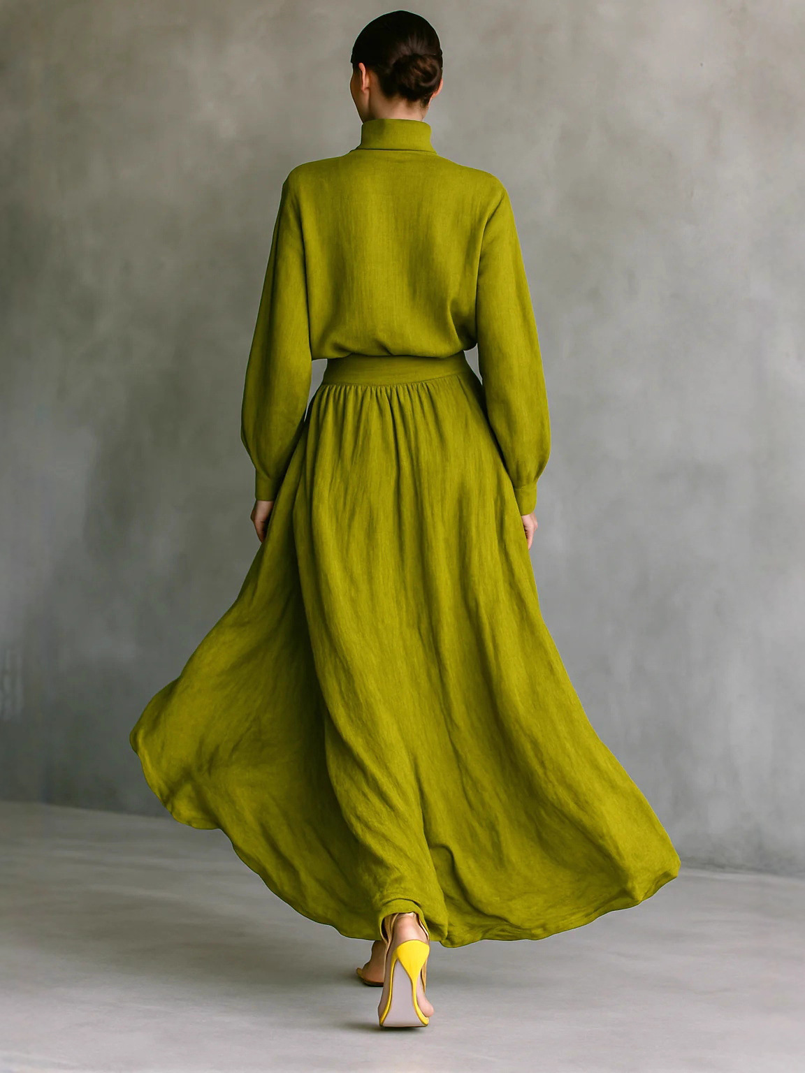 Versatile Long-Sleeve Turtleneck Top & Pleated Maxi Skirt with Pockets