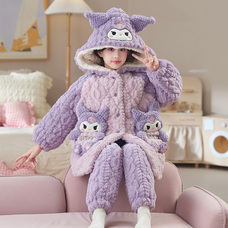 Children's pajamas girls three-layer quilted coral fleece thickened hooded nightgown